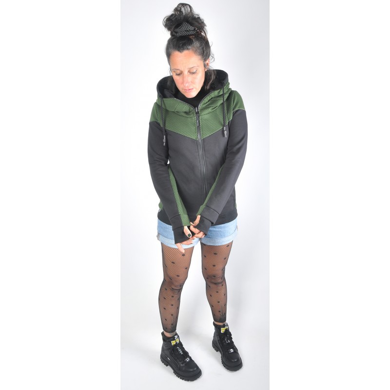 Dessuadora amb cremallera, coll alt, caputxa, butxaques i a les mànigues té
