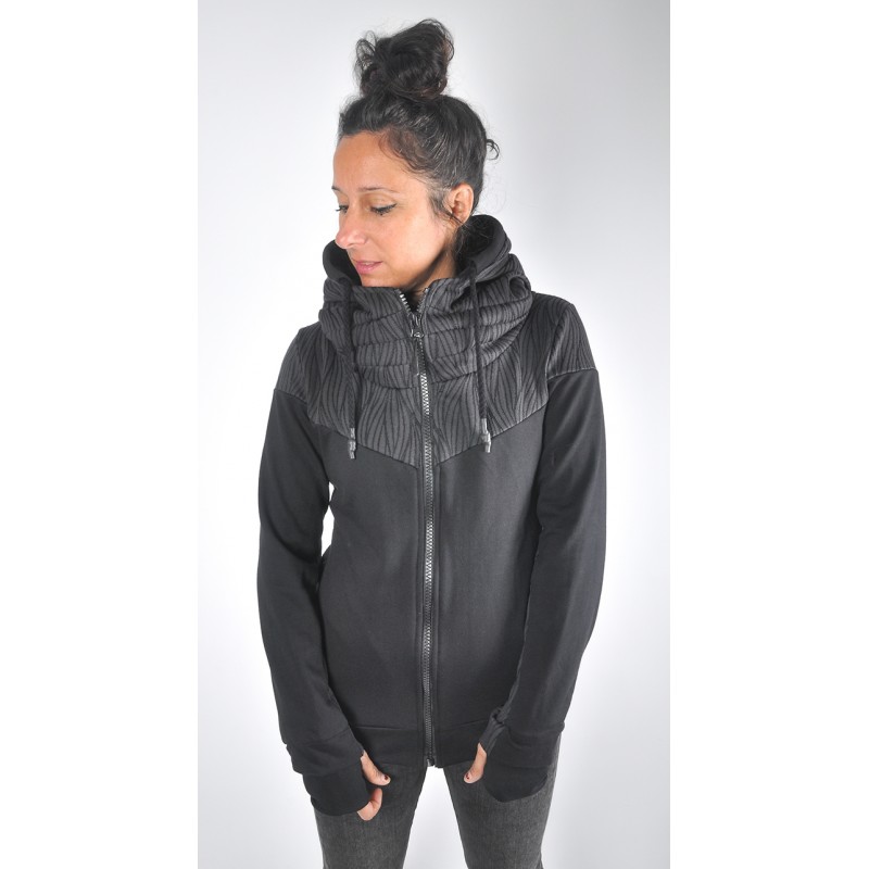 Dessuadora amb cremallera, coll alt, caputxa, butxaques i a les mànigues té