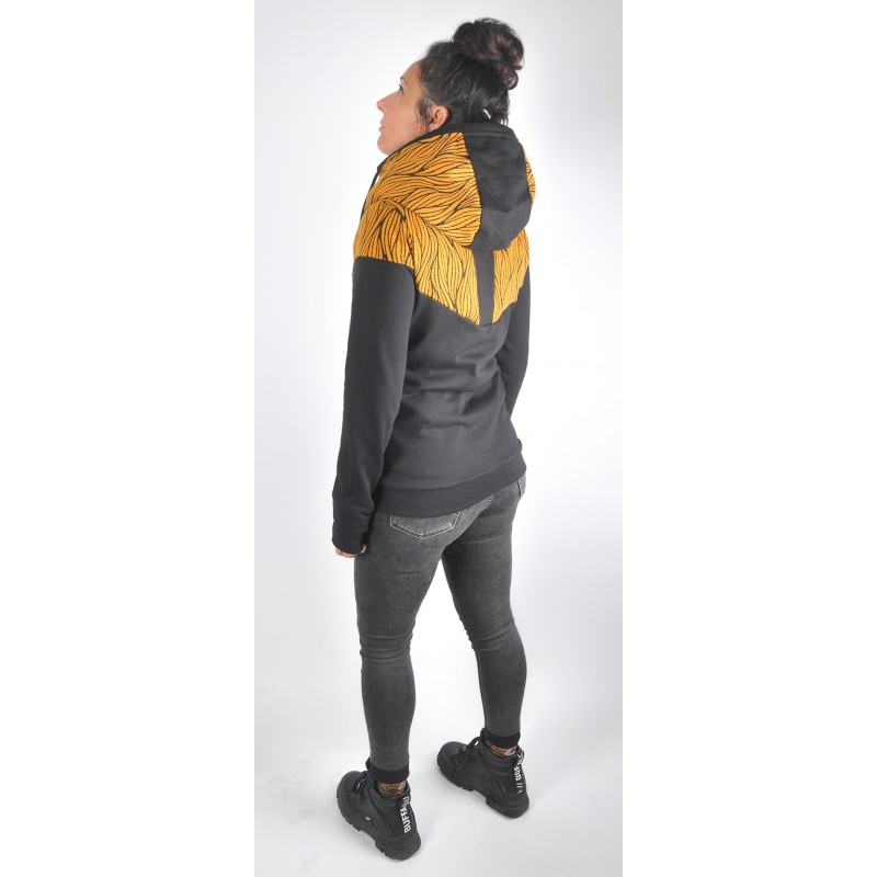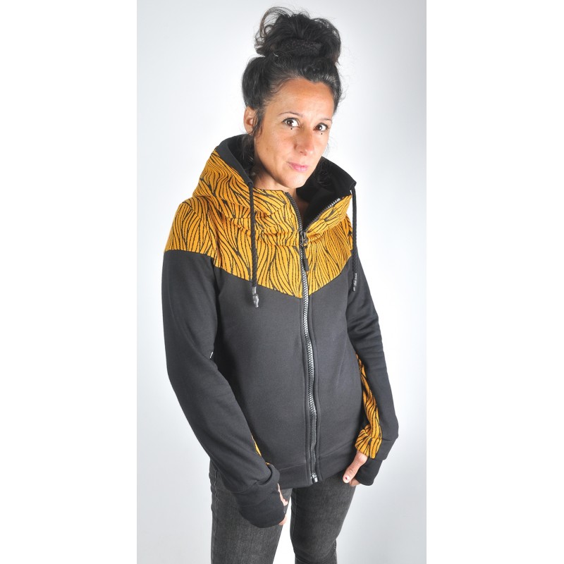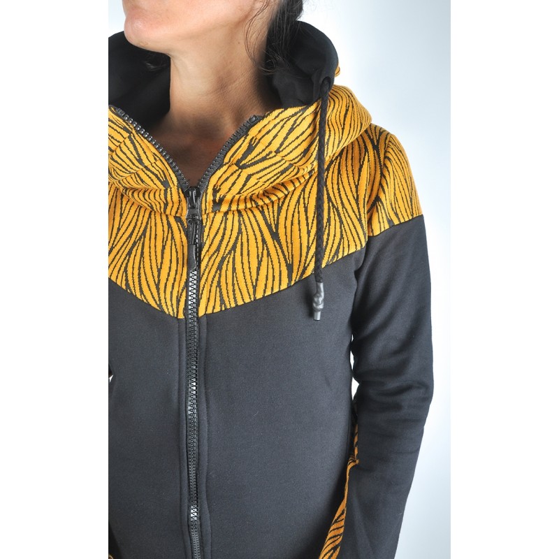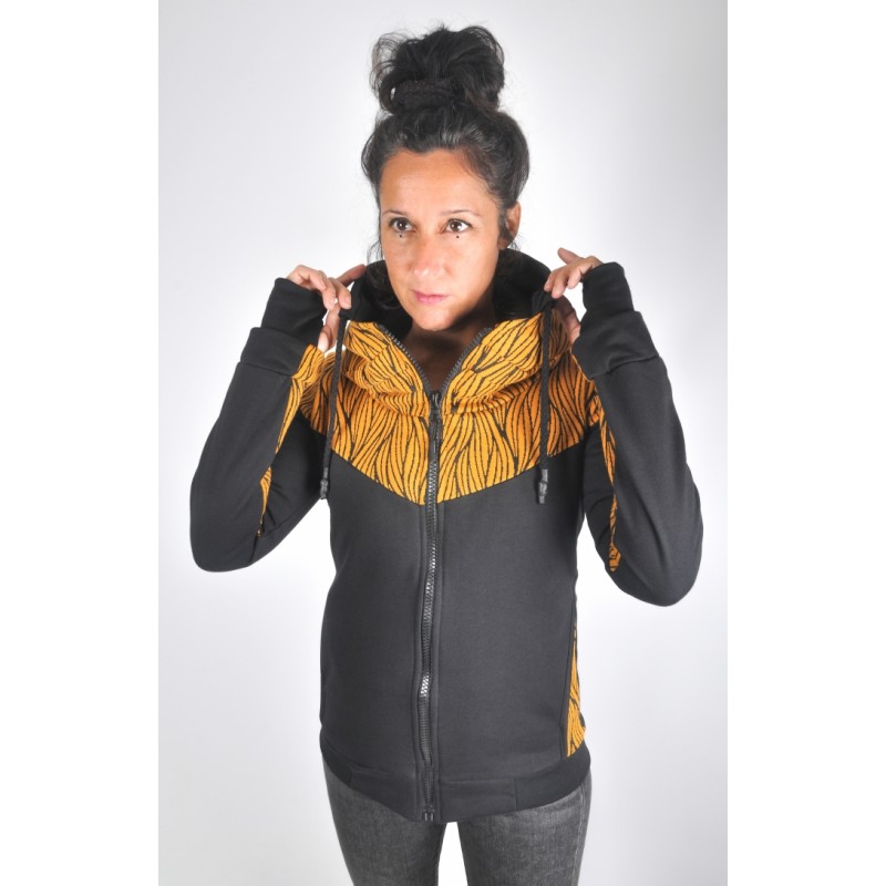 Dessuadora amb cremallera, coll alt, caputxa, butxaques i a les mànigues té