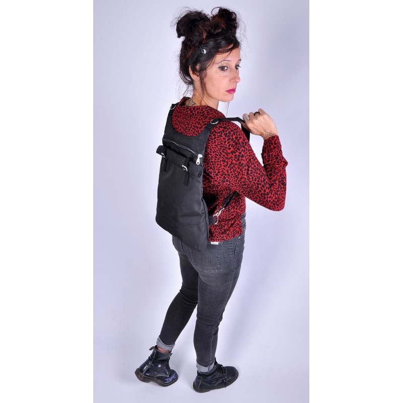 3 bolsillos, el principal con gran capacidad ,el bolsillo enrollado delantero y el bolsillo trasero, este funciona perfecto como antirobo.