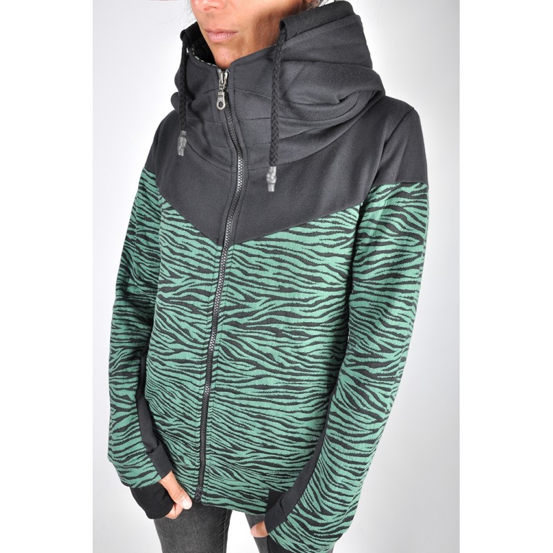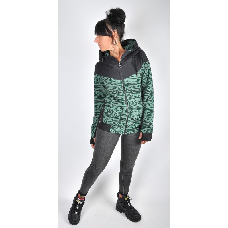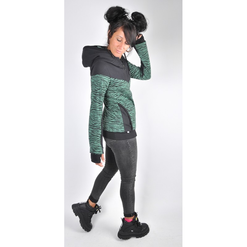 Sudadera con cremallera, cuello alto, capucha, bolsillos y en las mangas tiene