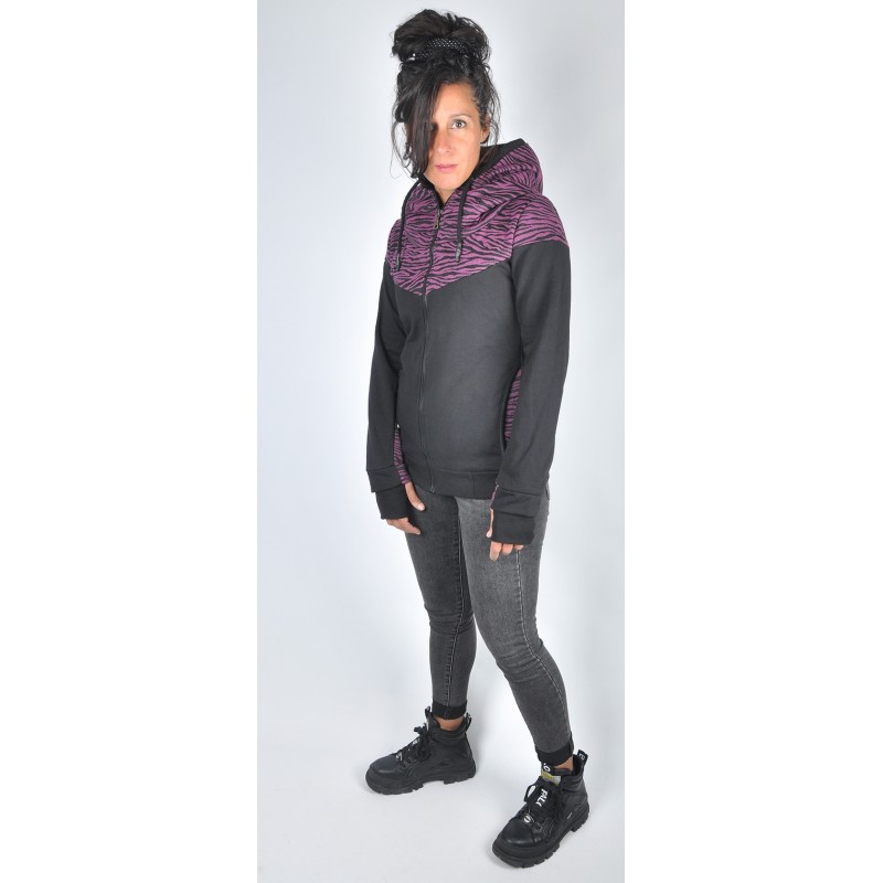 Sudadera con cremallera, cuello alto, capucha, bolsillos y en las mangas tiene
