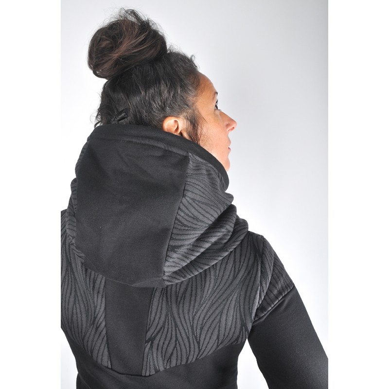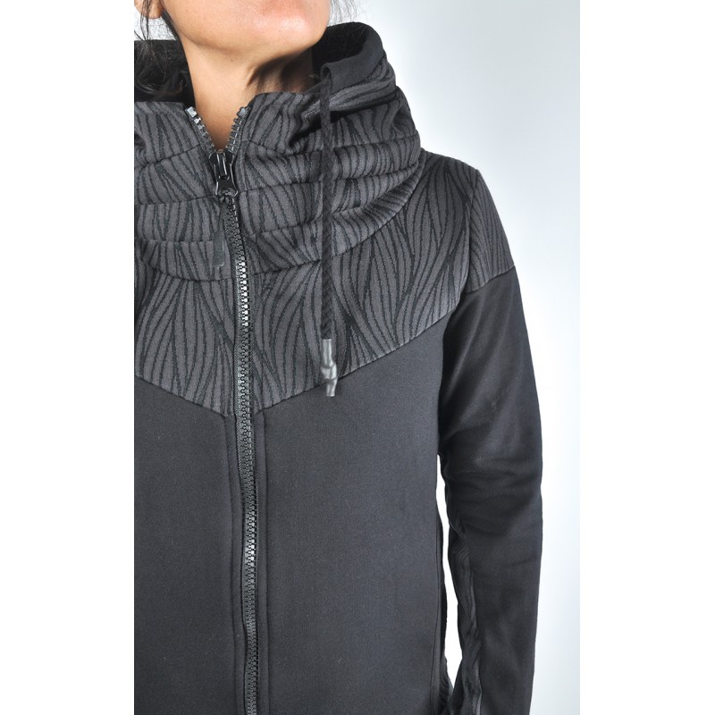 Sudadera con cremallera, cuello alto, capucha, bolsillos y en las mangas tiene