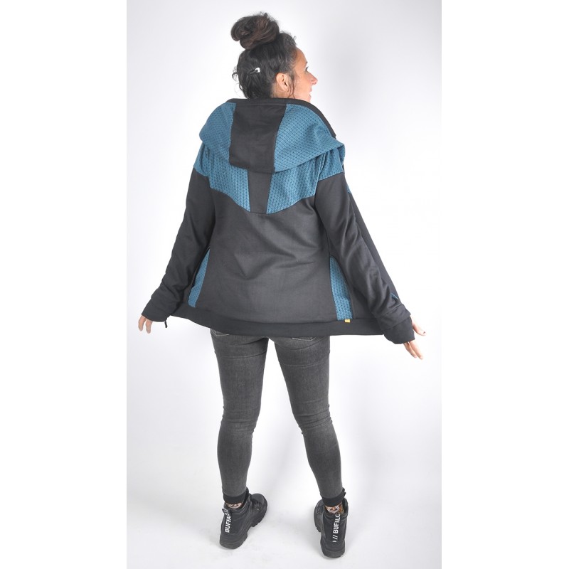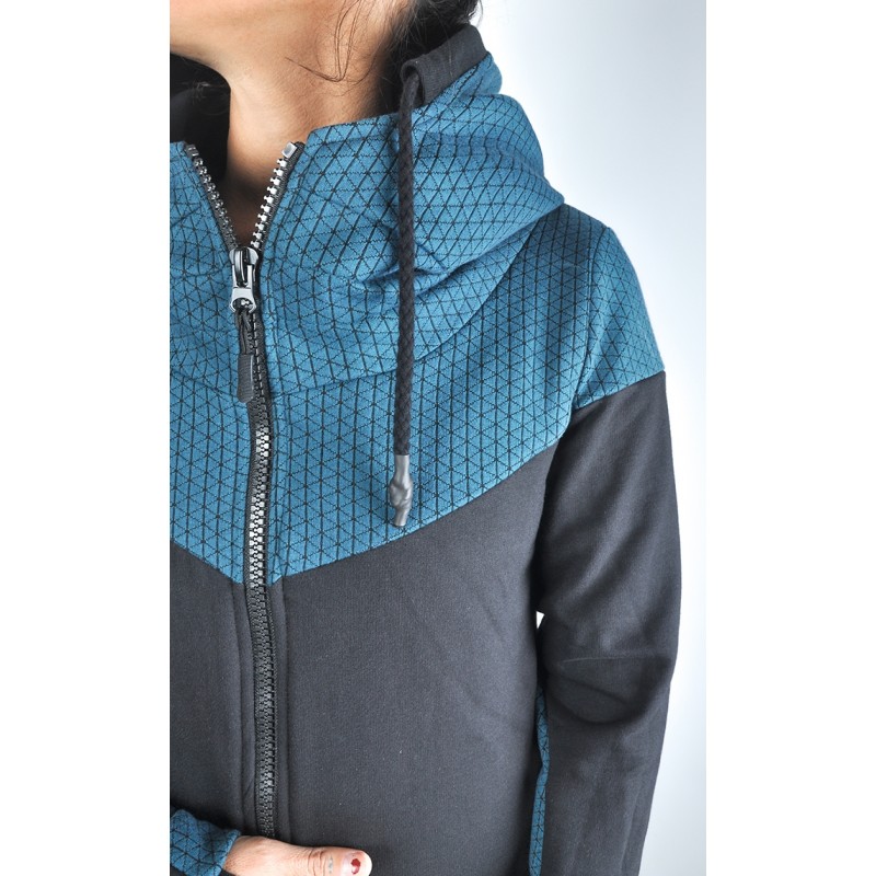Sudadera con cremallera, cuello alto, capucha, bolsillos y en las mangas tiene