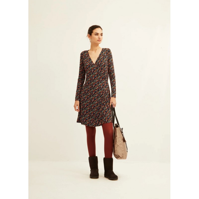 vestido con cuello pico, lleva cinturón para adaptarse a cada cuerpo